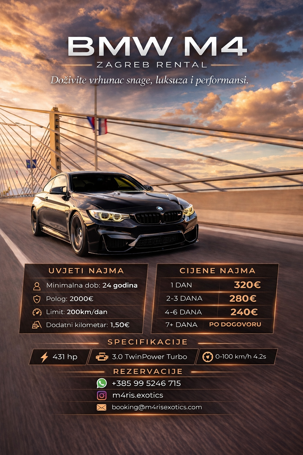 BMW M4 Competition je vrhunac njemačkog inženjerstva — kombinacija brutalne snage i sofisticiranog luksuznog dizajna. Sa 431 KS i TwinPower Turbo motorom, svaka vožnja je iskustvo koje se pamti zauvijek.